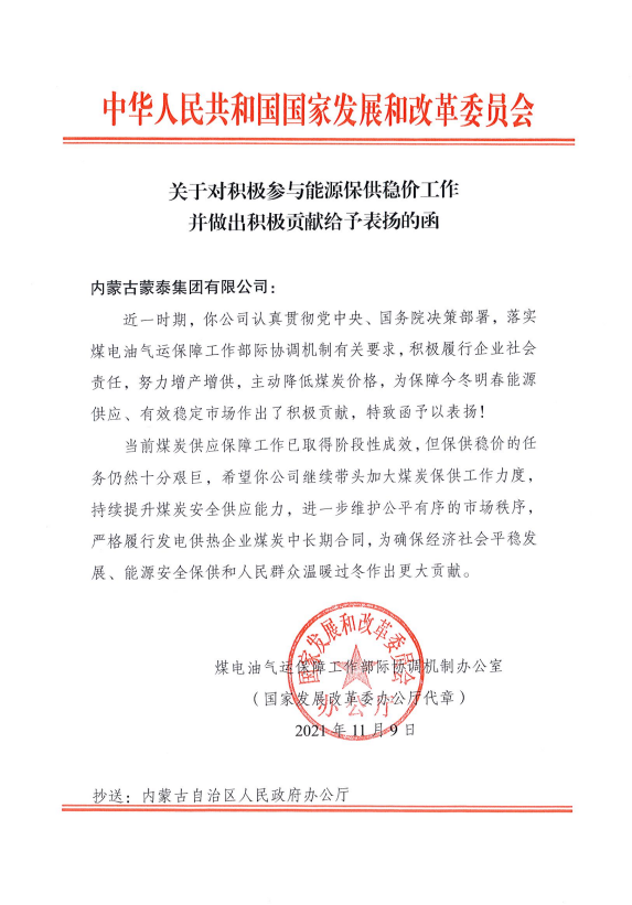 近日,蒙泰集团收到国家发改委表扬函,对蒙泰集团积极参与能源保供稳价工作并做出积极贡献给予表扬。这是对蒙泰集团能源保供稳价工作的高度评价。