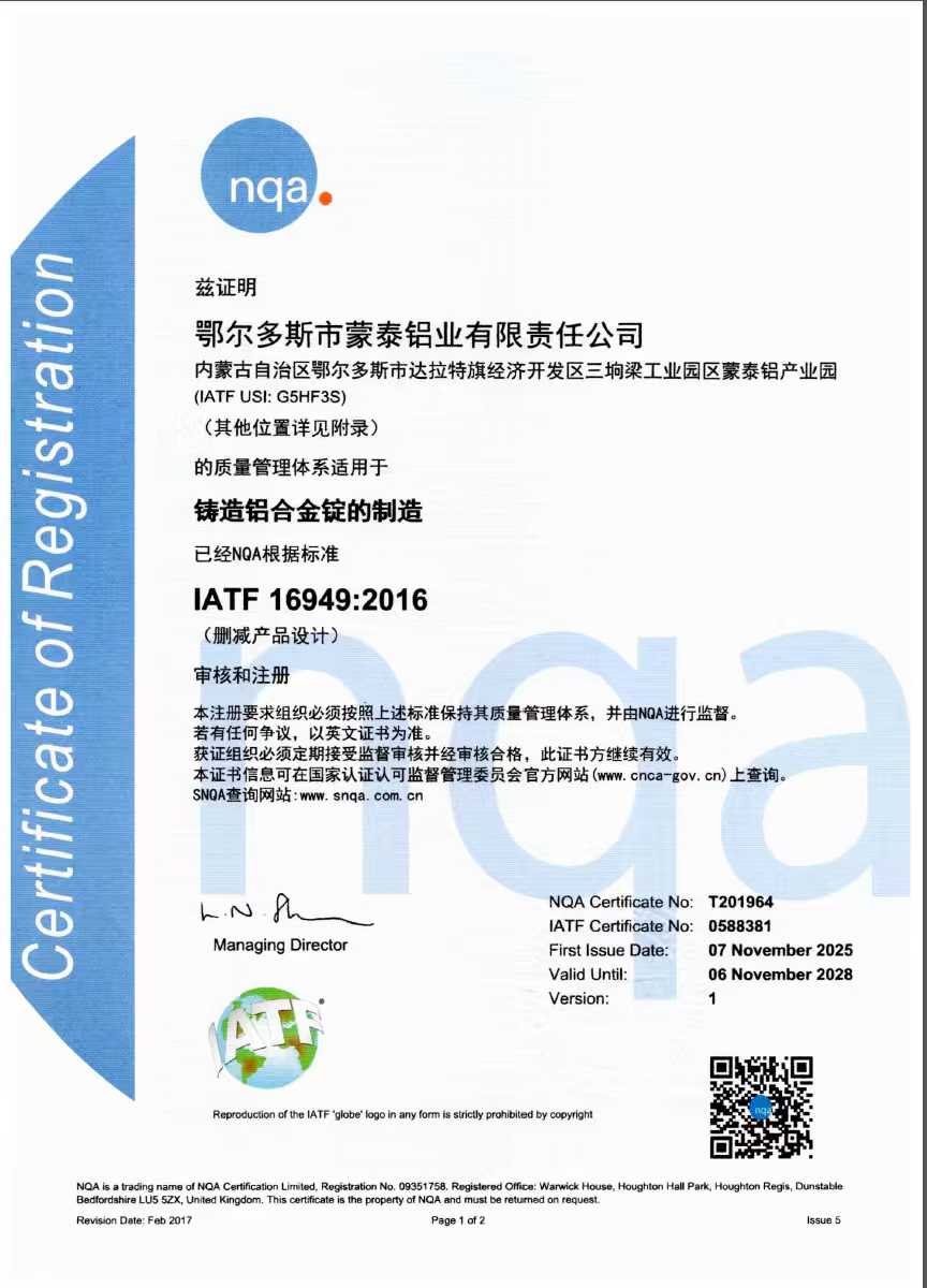 铝硅合金熔铸中试厂成功获得IATF 16949认证